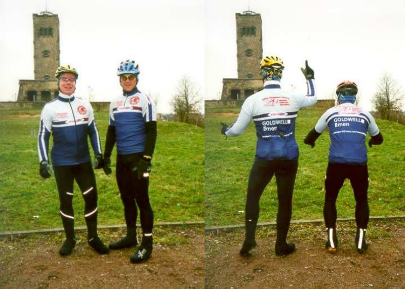 Allererste Anprobe der Trikots in der Langarmversion, denn es war ein normaler, deshalb kühler Samstagmittag im Frühjahr 2001. Gerhard und Peter führen dabei einen Tanz auf